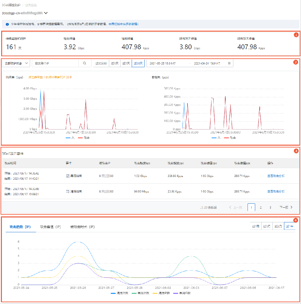 业务监控页面为您展示了DDoS原生防护实例上的业务防护数据(例如,被防护资产的流量趋势、DDoS攻击事件记录等),帮助您随时掌握业务的安全状态。本文介绍了查询业务监控数据的方法和相关数据的说明。前提条件已购买DDoS原生防护实例且为实例添加了防护对象。相关操作,请参见购买DDoS原生防护实例、防护对象。背景信息业务