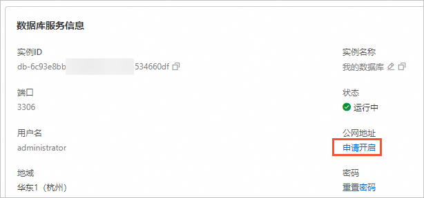 数据库实例默认不开启公网地址,如果您需要通过轻量容器服务或DMS公网访问数据库,您需要开启公网访问地址。本文介绍如何开启和关闭公网地址。操作步骤说明申请公网地址和后续产生的公网流量(包括出流量和入流量)暂不收费,带宽目前无限制。访问轻量应用服务器控制台-数据库服务。在数据库服务实例卡片中,单击实例ID。如