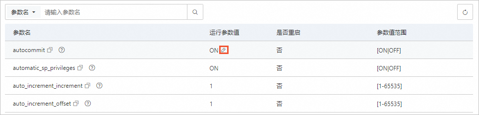 数据库服务创建后,您可以查看数据库的参数信息,或者根据业务需求修改数据库参数。本文介绍如何查看并修改数据库参数。操作步骤访问轻量应用服务器控制台-数据库服务。在数据库服务卡片中,单击实例ID。如果数据库服务较多,可在搜索文本框中,输入数据库服务实例ID筛选数据库服务。单击参数设置页签,您可以查看数据库的参