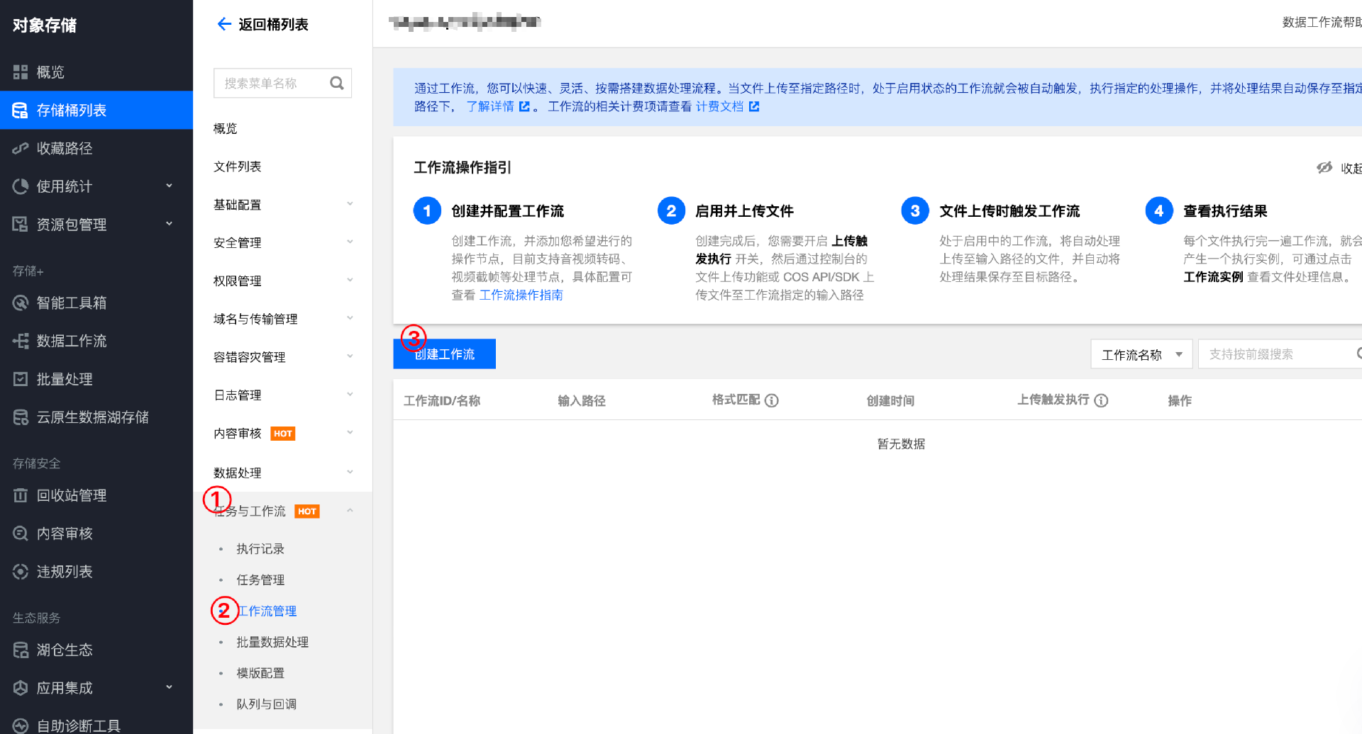 1. 进入存储桶管理页面,在左侧导航栏中,选择任务与工作流 -> 工作流管理,进入工作流管理页面,单击创建工作流。