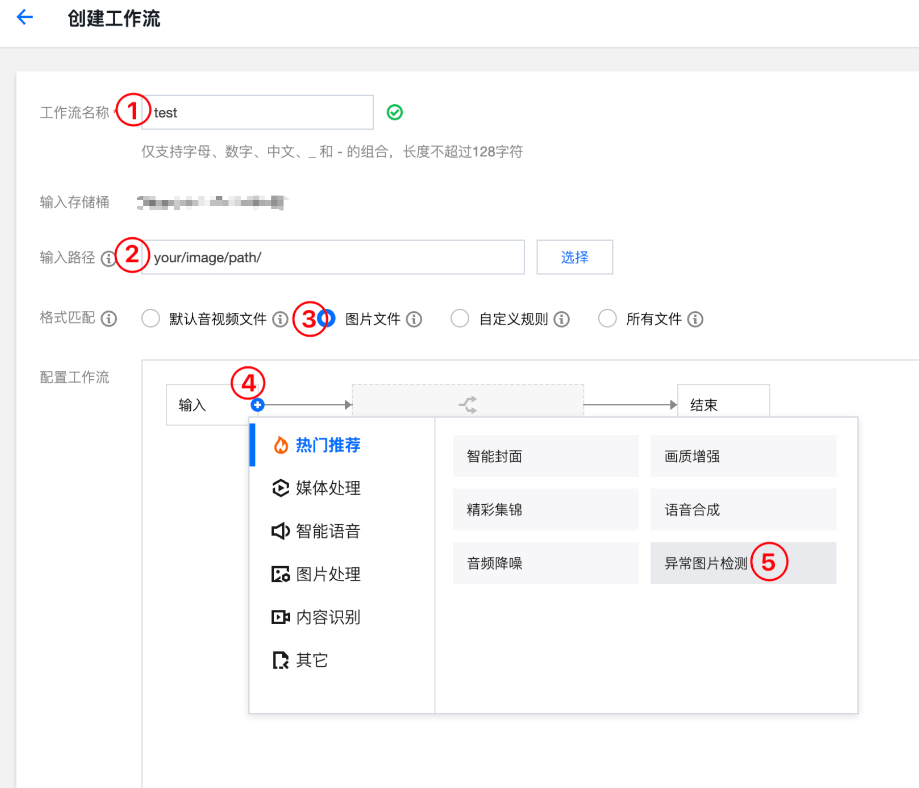 配置工作流:按以下操作配置异常图片检测功能: