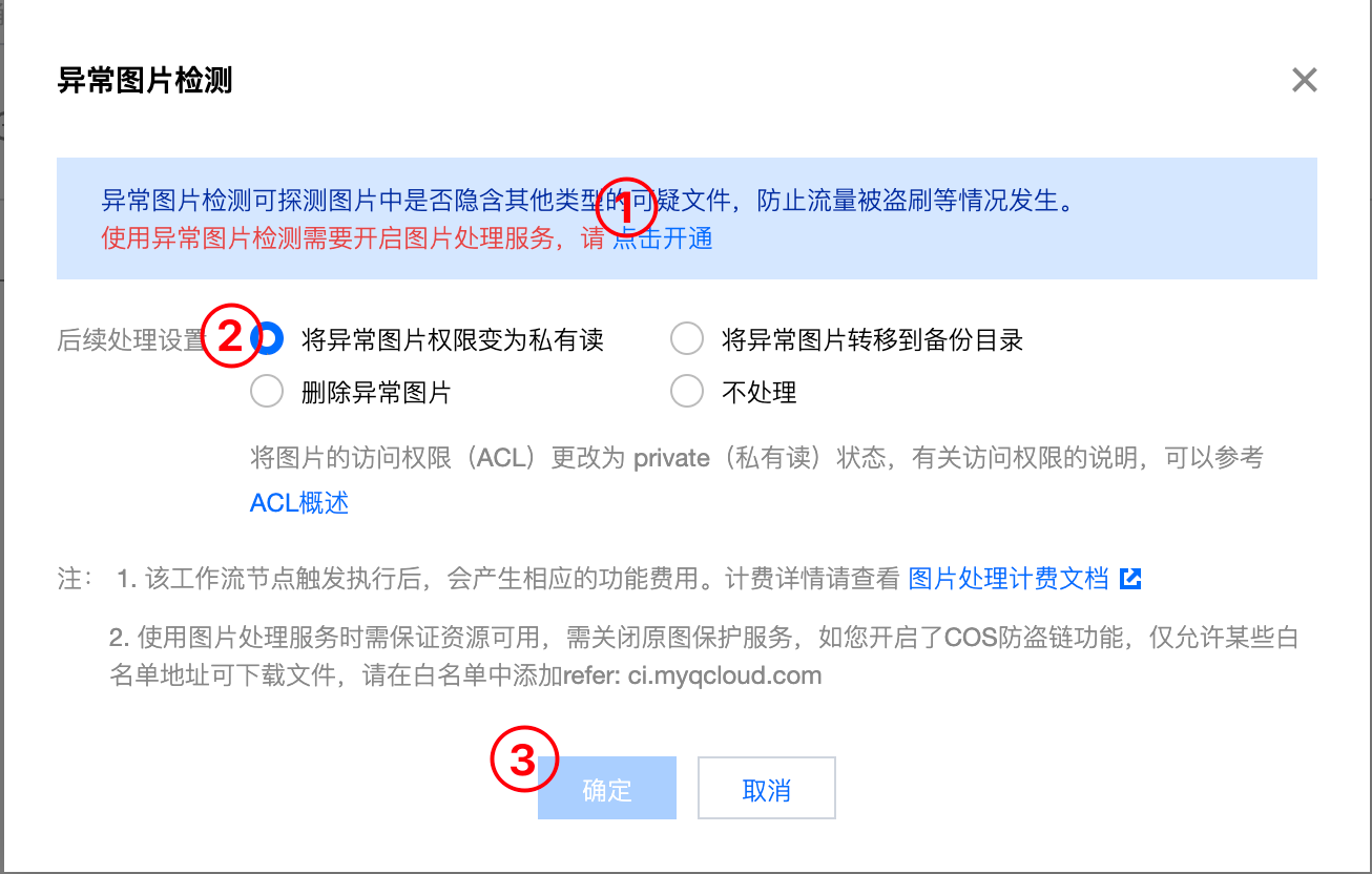 在异常图片检测配置弹窗中,按需要选择后续处理的设置,如弹窗顶部提示您需要开通图片处理异步处理服务,请点击开通。