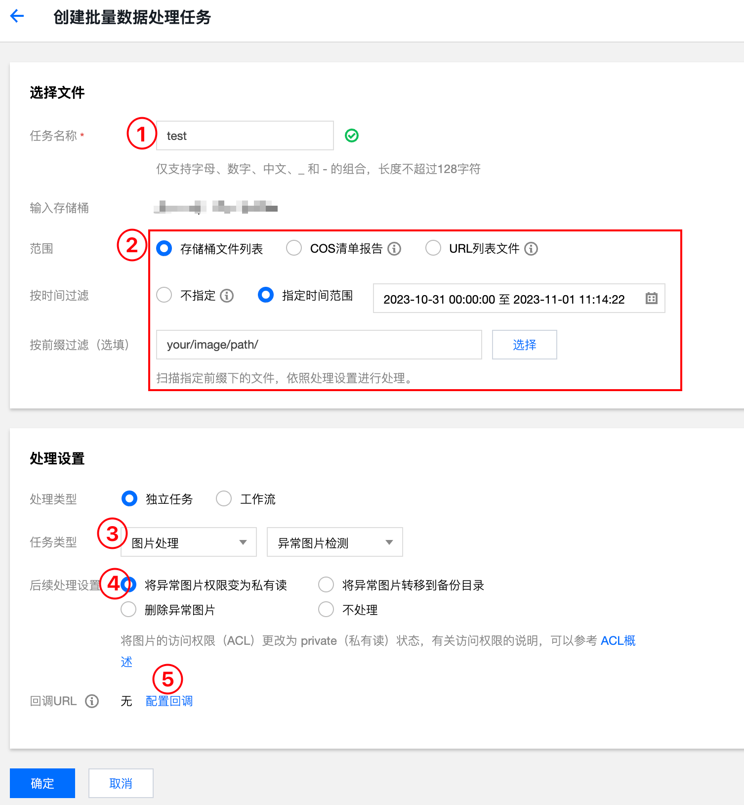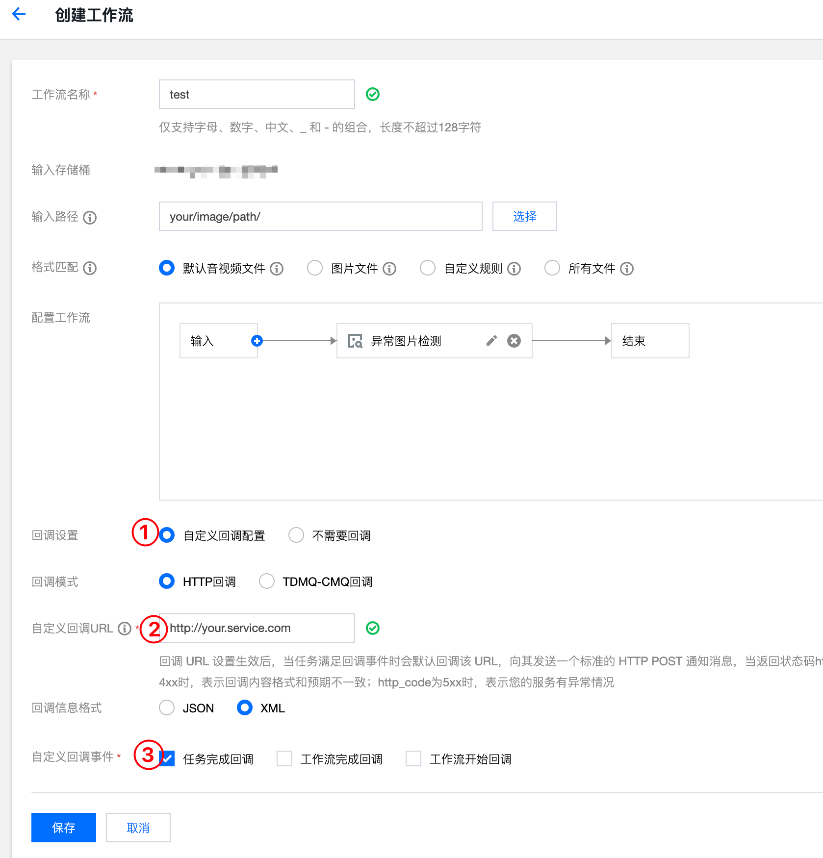 回调设置:可配置回调 URL 获取处理结果,如果异常图片检测的后续处理选择了不处理,强烈建议配置回调URL。