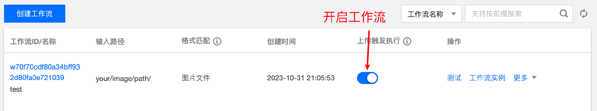3. 工作流默认为未启用状态,单击该工作流对应的状态按钮,即可启用工作流。工作流启用后,将在5分钟内生效。工作流生效后,后续上传的文件都将自动进行异常图片检测处理。