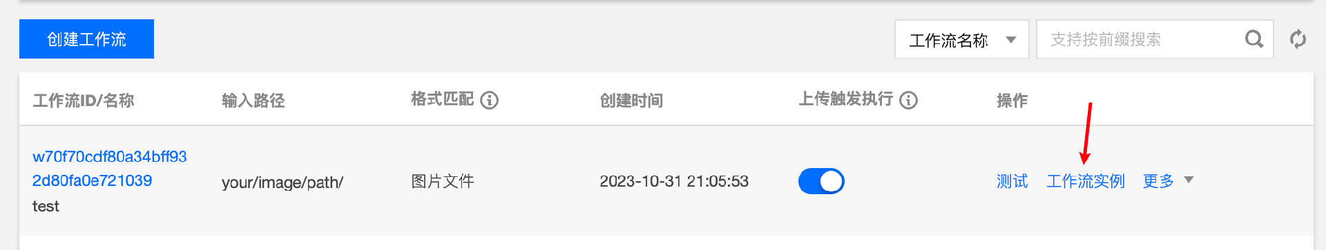 4. 上传图片文件后,点击 工作流实例 查看工作流的执行记录,进入当前执行记录的详情,查看异常图片检测的结果。