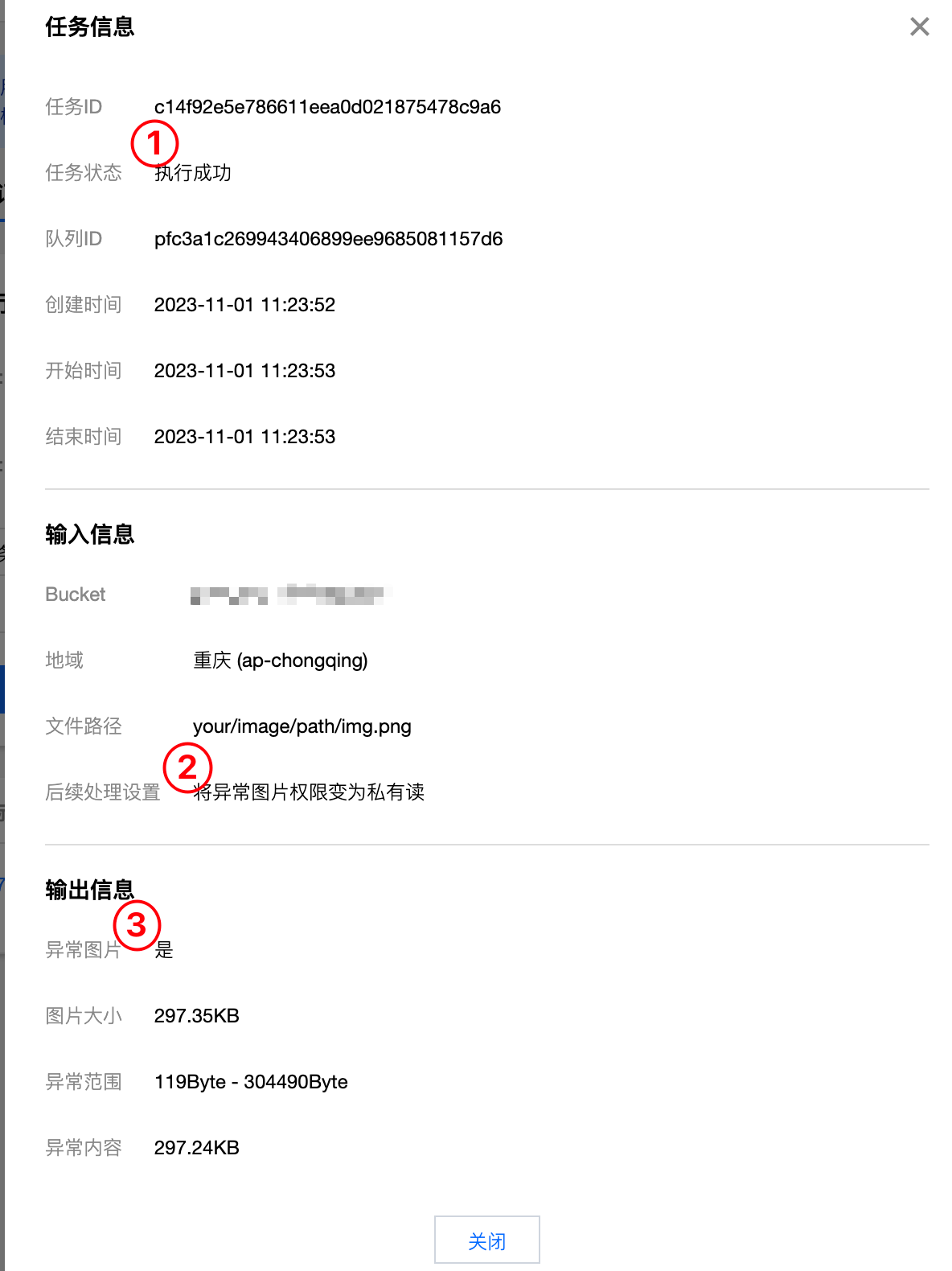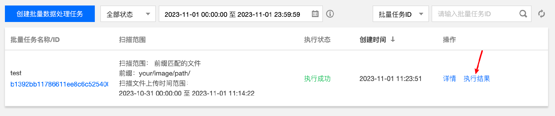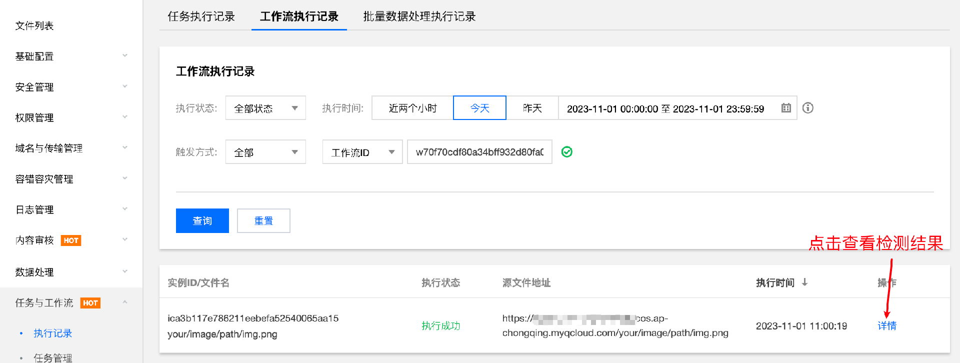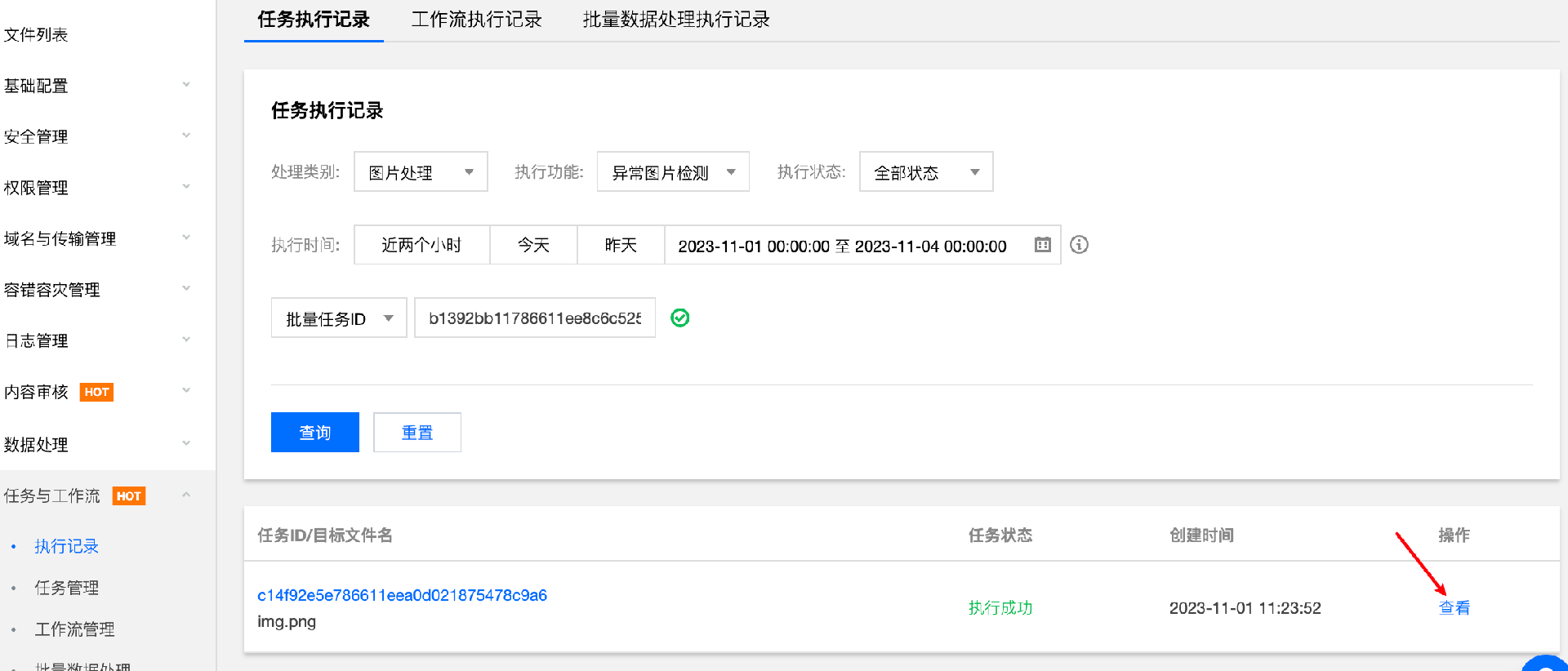 3. 点击 执行结果,前往任务执行记录页面查看批量执行情况,进入当前任务记录的详情,查看异常图片检测的结果。