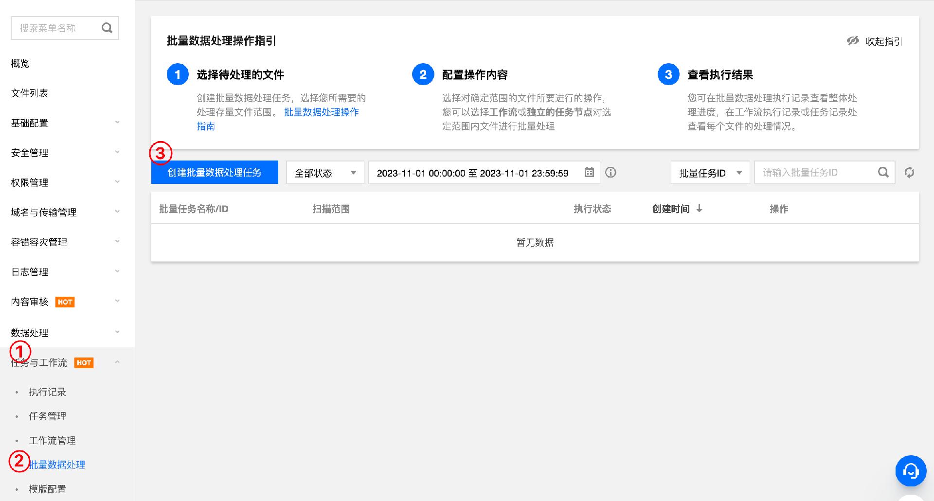 1. 进入存储桶管理页面,在左侧导航栏中,选择任务与工作流 -> 批量数据处理,进入批量数据处理页面,单击创建批量数据处理任务。