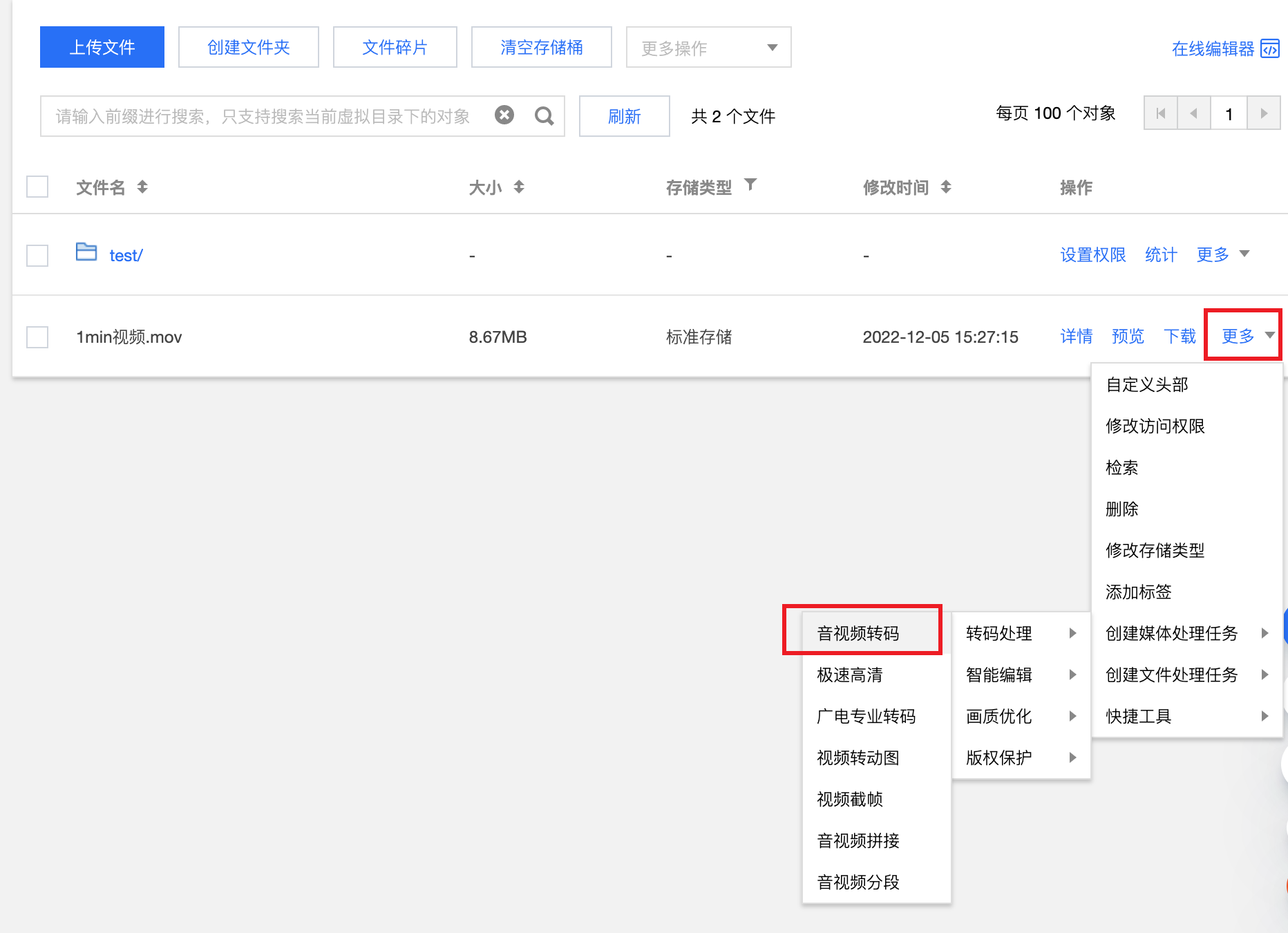 1. 选择待处理的COS媒体文件,并创建 音视频转码 任务。