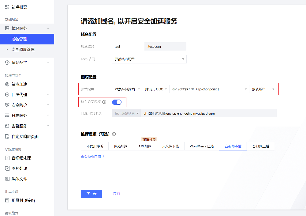 回源鉴权保护:为保障视频资源安全,推荐将 COS 存储桶的 ACL 访问权限设为私有读,并在 EdgeOne 域名配置中开启回源鉴权,进一步强化资源安全性。