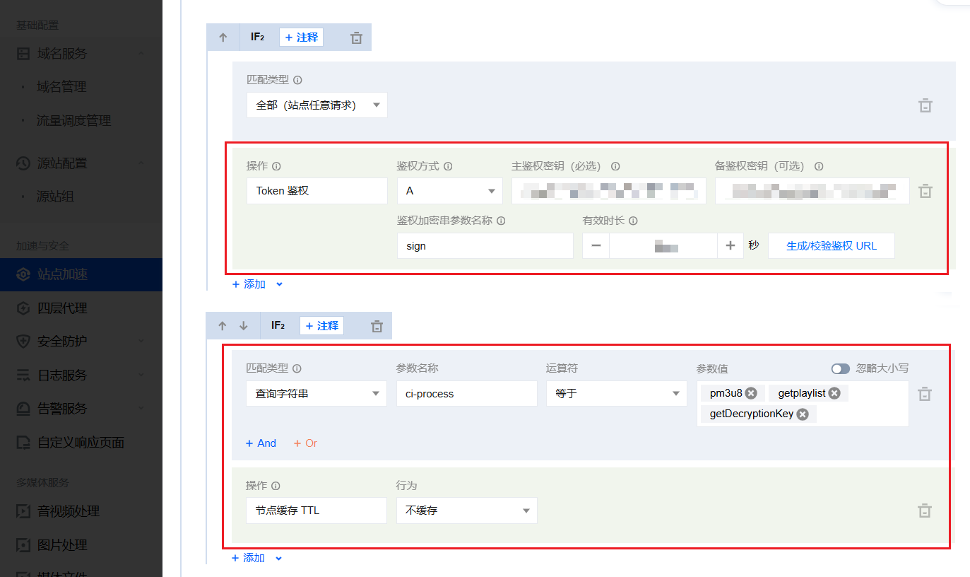 2. 对带有请求参数 ci-process 是 pm3u8、getplaylist、getDecryptionKey 的请求,特殊配置为不缓存。