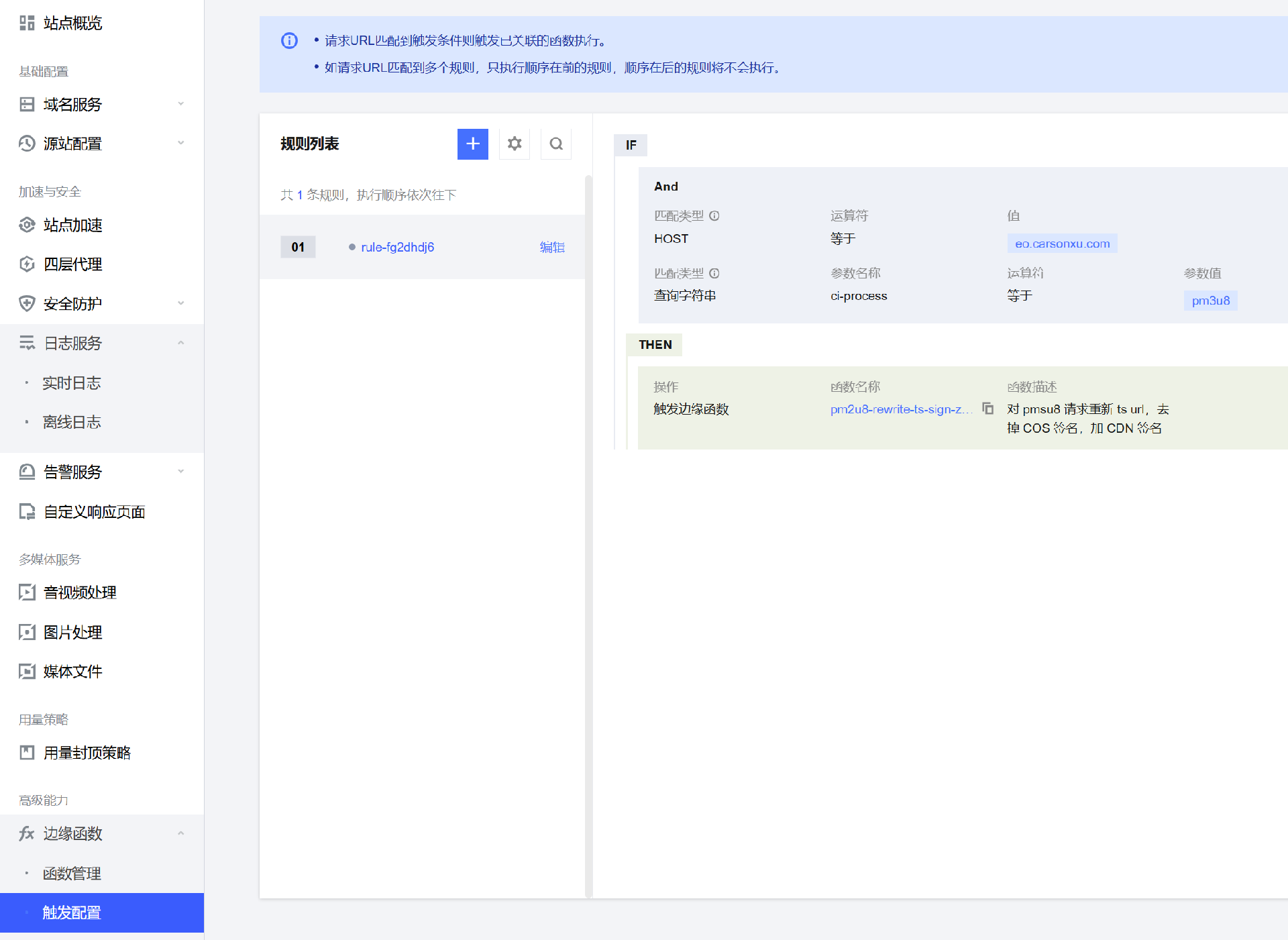 在 EdgeOne 控制台,进入边缘函数 > 函数管理,根据 edge-functions.zip 代码配置,按需修改最前面的代码里的鉴权密钥 PK、签名有效时间 TTL、签名参数名 KEY_NAME。保存并发布函数。并在函数触发配置里,指定触发条件为查询字符串带有 ci-process = pm3u8的请求。