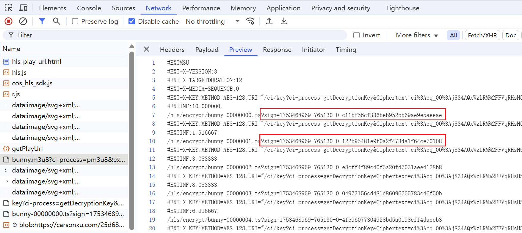 2. 尝试在前端页面播放视频,会看到 pm3u8 请求返回的 .ts 链接已被替换为带有 EdgeOne 签名 ?sign=xxx 的链接,并且能正常播放 COS HLS 私有加密视频。