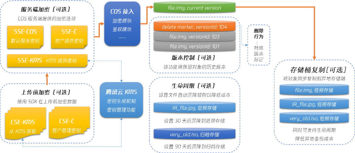 腾讯云 COS 提供了包括数据加密、版本控制、存储桶复制和生命周期等多种功能在内的数据管理能力支持。敏感文件可通过加密功能保障数据读写安全;通过版本控制和存储桶复制实现异地容灾,进一步保证数据持久性,确保数据误删或者被恶意删除时可从备份站点恢复数据;通过生命周期进行数据沉降和删除,减少数据存储成本。