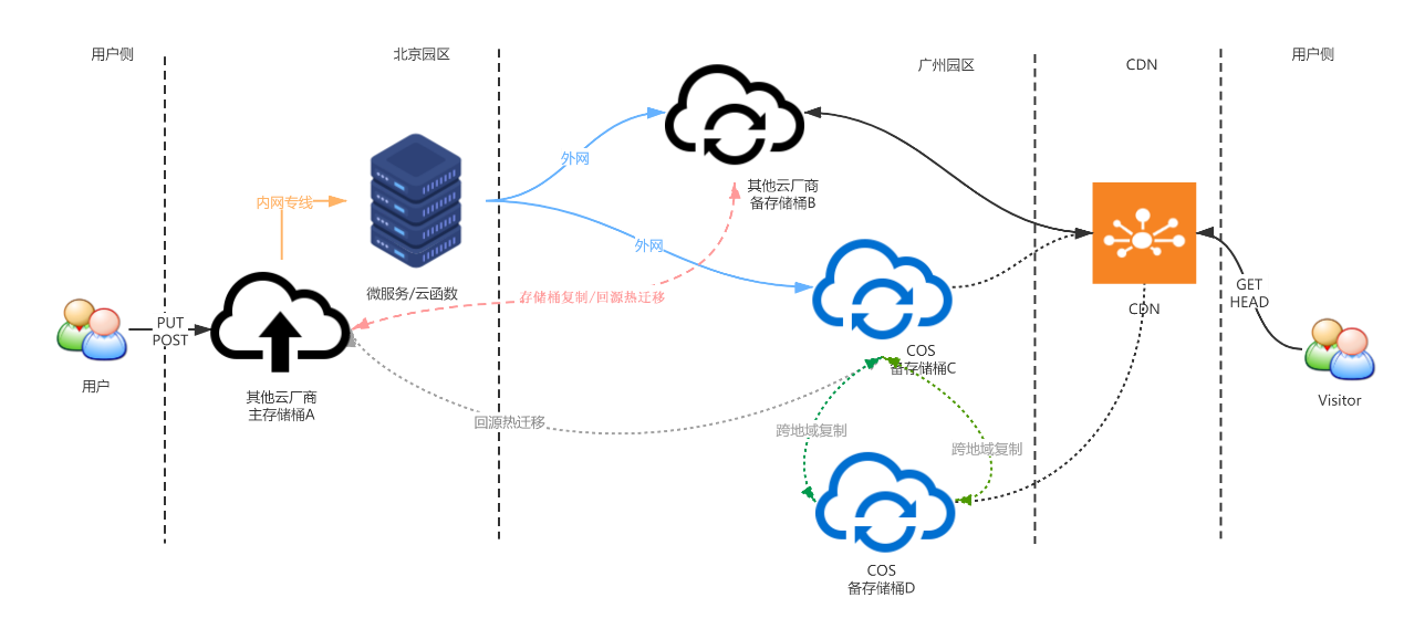 对于一些数据主要存储在其他云厂商,且对数据持久性要求苛刻的客户,COS 也提供基于云函数的多云灾备方案。首先数据存储在其他云厂商上(如 AWS 或者 OSS),客户可通过云函数触发数据同步或者存储桶复制实现异地容灾,保障数据持久性;同时,通过云函数触发数据迁移,将核心数据备份到腾讯云的对象存储服务上,并通过腾讯云的存储桶复制功能,实现异地灾备;最后,通过腾讯云的权限管控,管理 COS 的数据访问权限,保障极端情况下数据可从腾讯云 COS 上恢复数据。