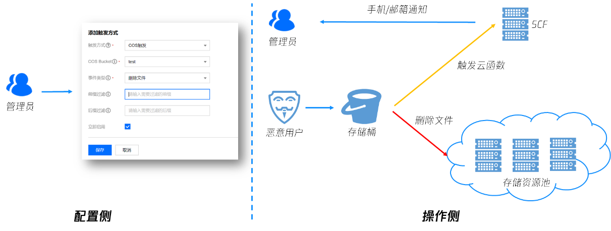 腾讯云 COS 基于云函数提供了事件通知功能。对于删除文件这类高危操作,可以通过 SCF 针对 DeleteObject 这类高危操作配置云函数,在高危操作行为发生时,即刻发送通知到邮箱或者手机上,确保可以及时发现高危行为,并采取手段中止。