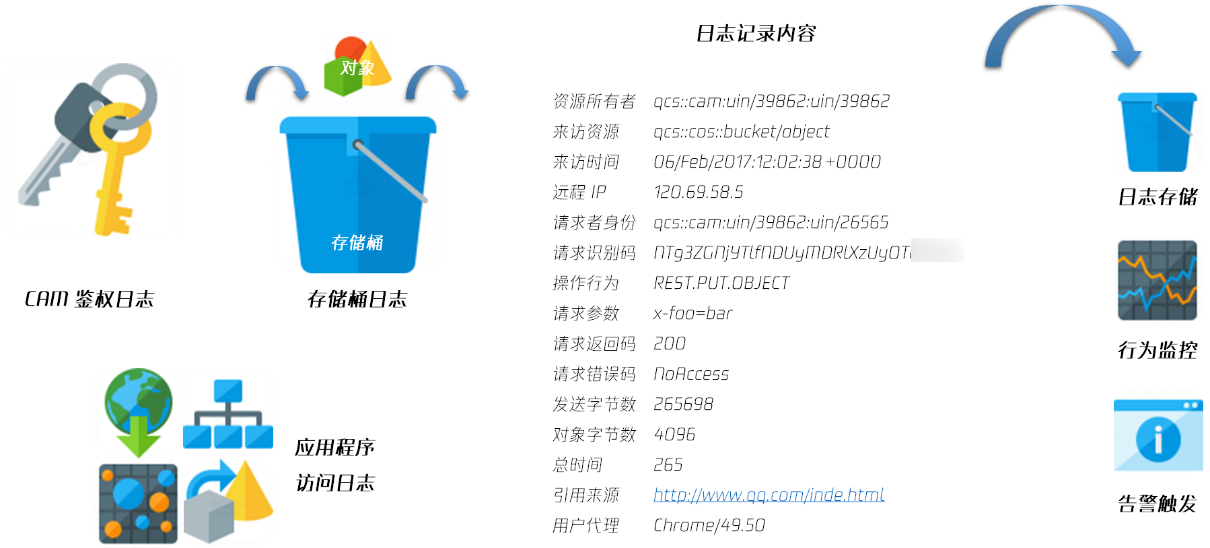 腾讯云 COS 为用户提供了多渠道低门槛的日志监控和审计功能。对于存储桶的用户访问日志,如删除文件(DeleteObject)、覆盖写文件(PutObjectCopy)、修改文件权限(PutObjectACL)等操作,均可通过存储桶访问日志功能进行追踪,删除操作等高危行为可追溯可查证;对于存储桶配置管理行为,如删除存储桶(DeleteBucket)、修改存储桶访问控制列表(PutBucketACL)、修改存储桶策略(PutBucketPolicy)等操作,可通过操作审计日志进行追踪,权限配置修改等行为也可追溯查证。