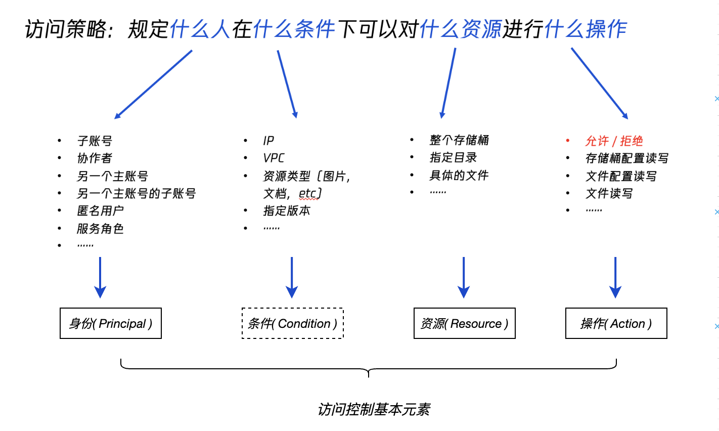 默认情况下,COS 资源(包括 Bucket 和 Object)都是私有权限,只有资源拥有者或者被授权的用户允许访问。若希望规定什么人在什么条件下可以对什么资源进行什么操作,可以结合 最小权限原则 通过多种设置权限的方式实现访问控制。按照策略出发点,可划分为基于资源和基于用户两种方式,分别包括存储桶策略、存储桶 ACL 、对象 ACL 和用户策略(CAM 策略)。关于策略的更多介绍请参见 访问控制基本概念。
