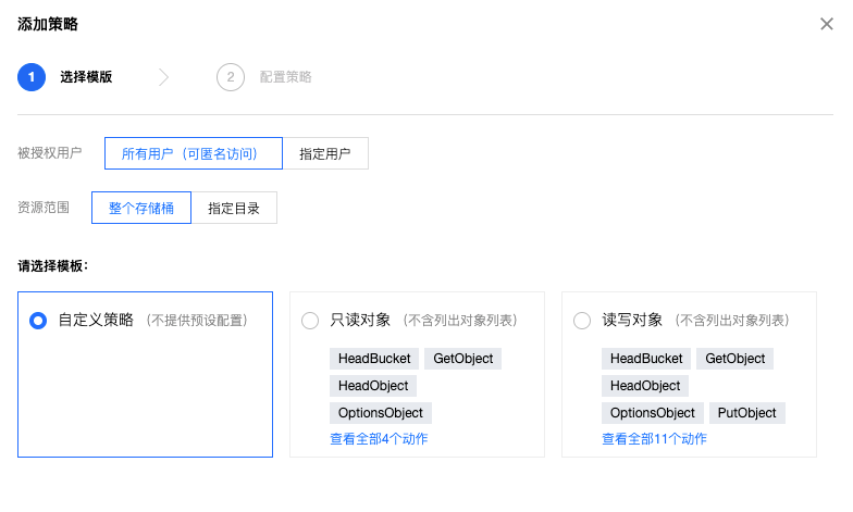 3. 选择模版(可选):COS 为您提供了多种策略模板,帮助您快速配置存储桶策略,可按需选择。详细操作步骤和配置说明参见 添加存储桶策略。