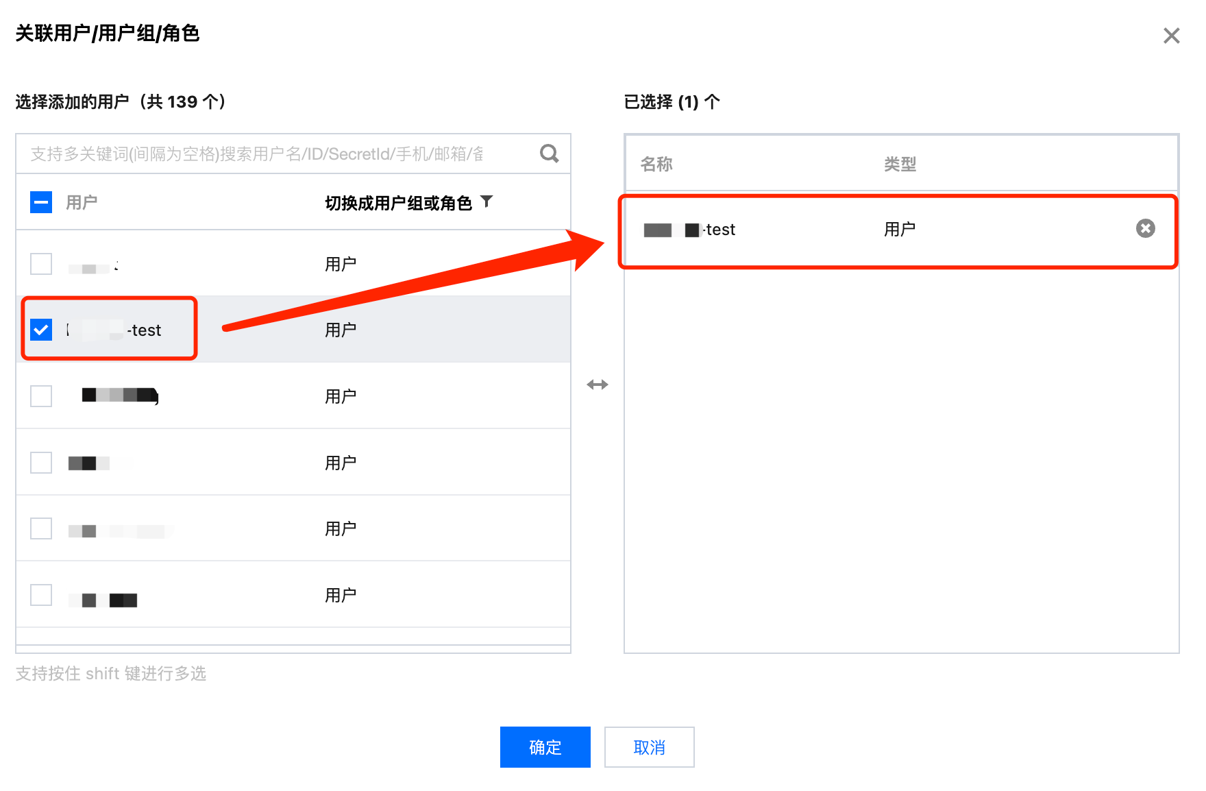 3. 在弹出页面勾选要关联的用户,单击确定即可完成通过策略关联用户操作。