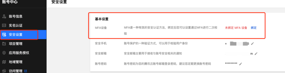 2. 在基本设置栏中,找到 MFA 设备,单击绑定,根据页面提示完成身份验证。