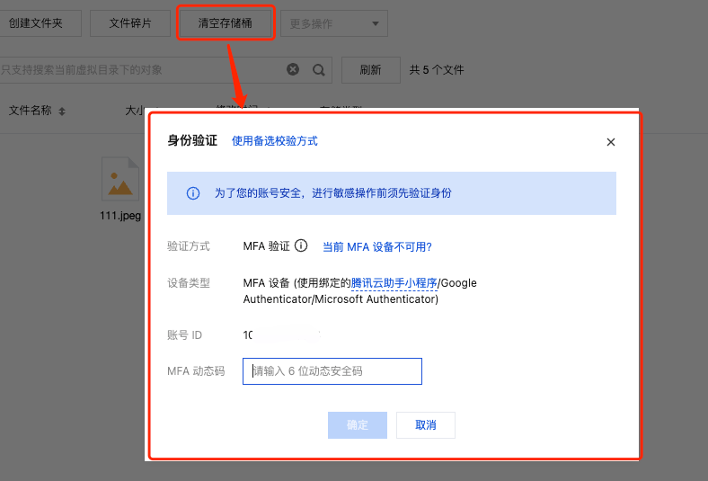 4. 进入文件列表页,单击 清空存储桶 ,此时会弹出 MFA 校验二次确认,进一步降低误删的风险。