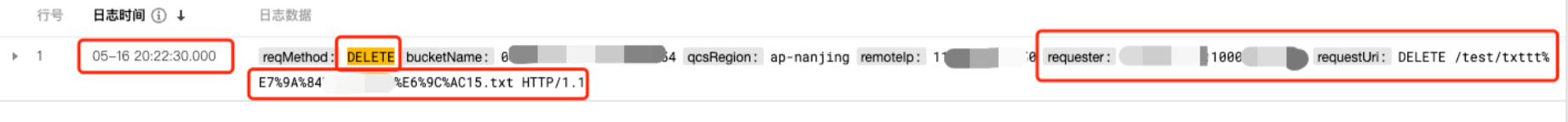 3. 单击搜索即可查询出执行了 DELETE 请求的结果。如下图所示,txttt 文件于5月16日20点22分被用户100xxxxxxxxx执行了删除操作。