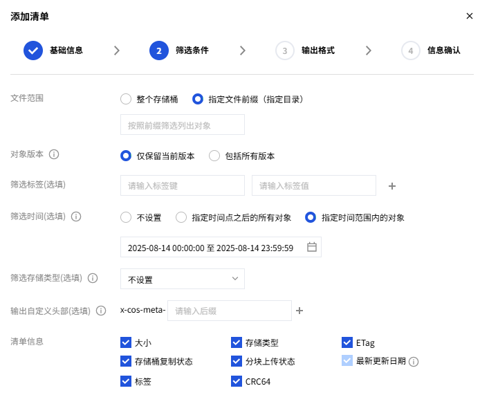4. 在清单配置过程中,您可根据实际场景按需填写筛选条件,对象版本需要选择“包括所有版本”,其他参数配置说明请参见 设置清单。以下为几种常用场景示例: