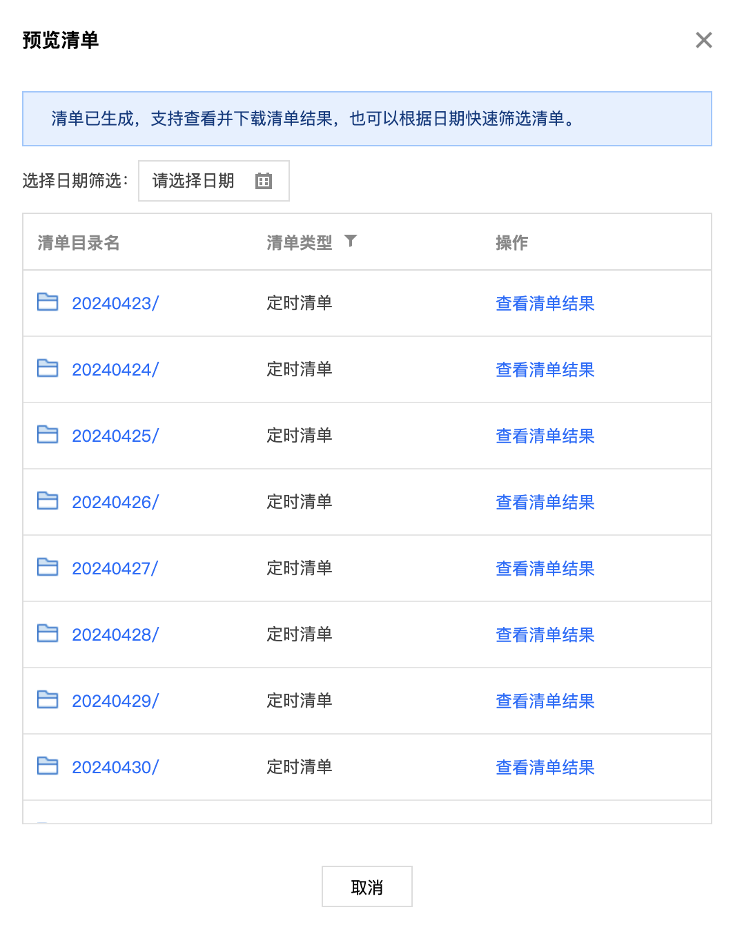 6. 筛选日期和清单目录之后,找到所需清单,单击查看清单结果。