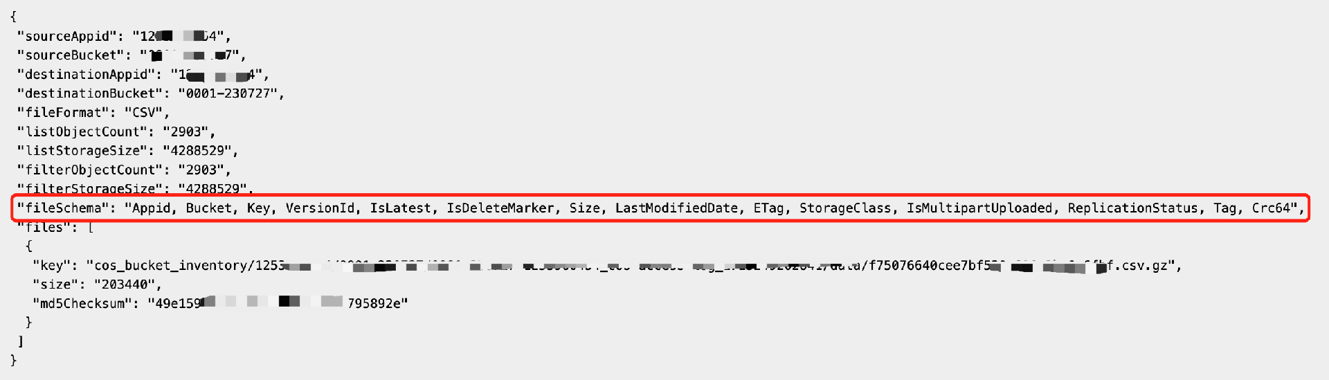 8. 解压之后的 CSV 文件描述了对象信息,您可以根据 IsDeleteMarker 和 LastModifiedDate 确定被删除的对象。其中,CSV 文件对应的字段名称可在 manifest.json 文件的“fileSchema”中查看,更多字段含义和描述请参见 清单参数。