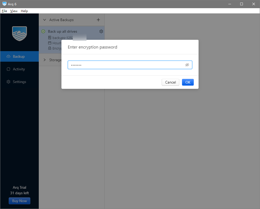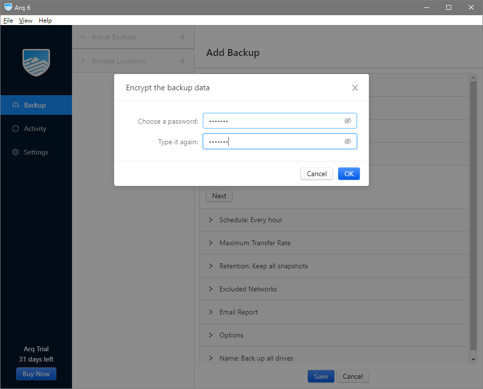 10. 在弹窗中设置用于加密的密码。输入两次用于加密备份文件的密码,并单击 OK。注意请牢记备份密码,否则将无法从备份恢复文件!