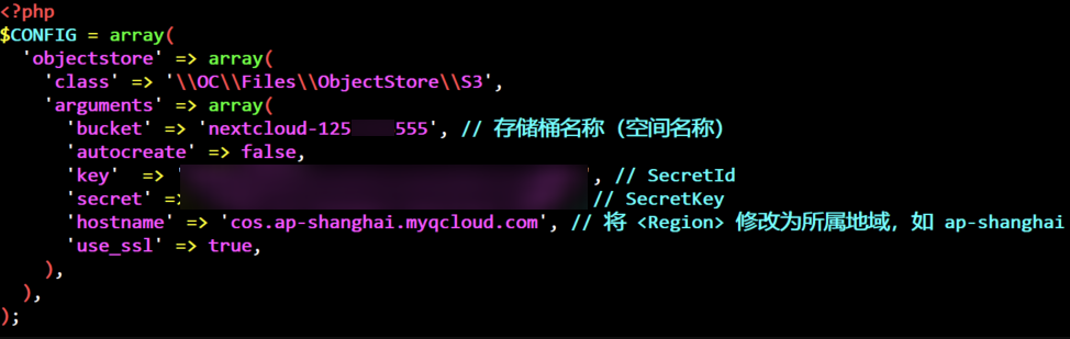 <?php$CONFIG = array( 'objectstore' => array( 'class' => '\\OC\\Files\\ObjectStore\\S3', 'arguments' => array( 'bucket' => 'nextcloud-1250000000', // 存储桶名称(空间名称) 'autocreate' => false, 'key' => '************************************', // 替换为用户的 SecretId 'secret' => '************************************', // 替换为用户的 SecretKey 'hostname' => 'cos.<Region>.myqcloud.com', // 将 <Region> 修改为所属地域,如 ap-shanghai 'use_ssl' => true, ), ),);