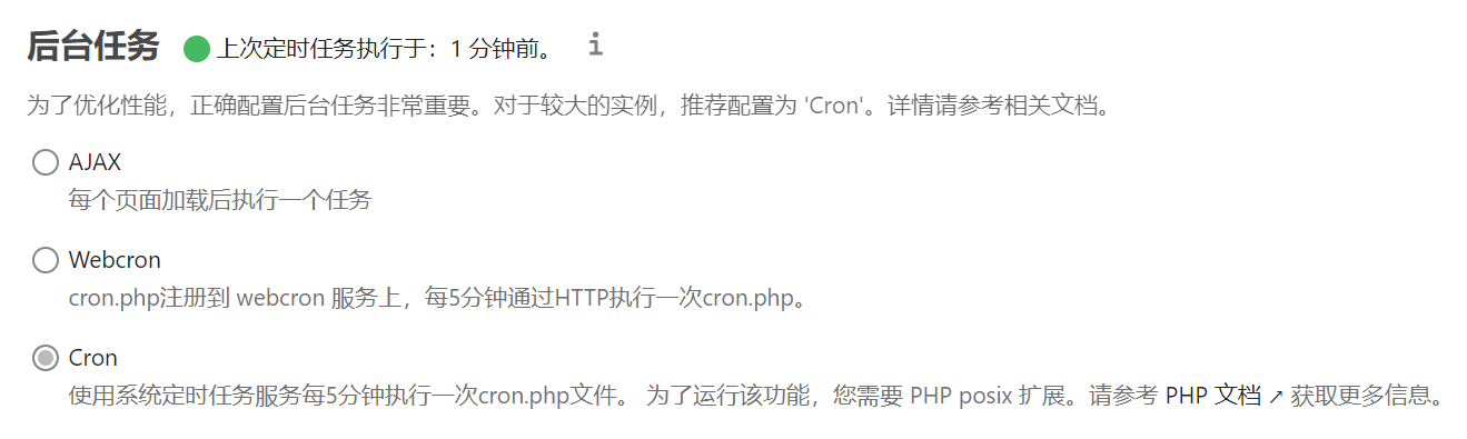 NextCloud 服务端有时需要在无需用户交互时执行一些后台任务,例如数据库清理等操作。PHP 的运行特性限制了基于 PHP 的程序无法内部维持一个独立的工作进程或线程,因此类似后台任务的场景需要由外部主动调用对应的 PHP 程序来执行。