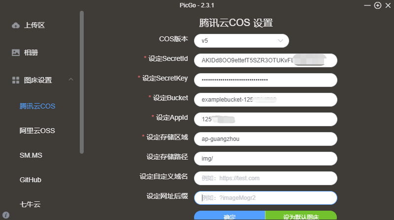 在 PicGo 官网 下载和安装 PicGo 后,在图床设置里找到腾讯云 COS,并配置以下相关参数项: