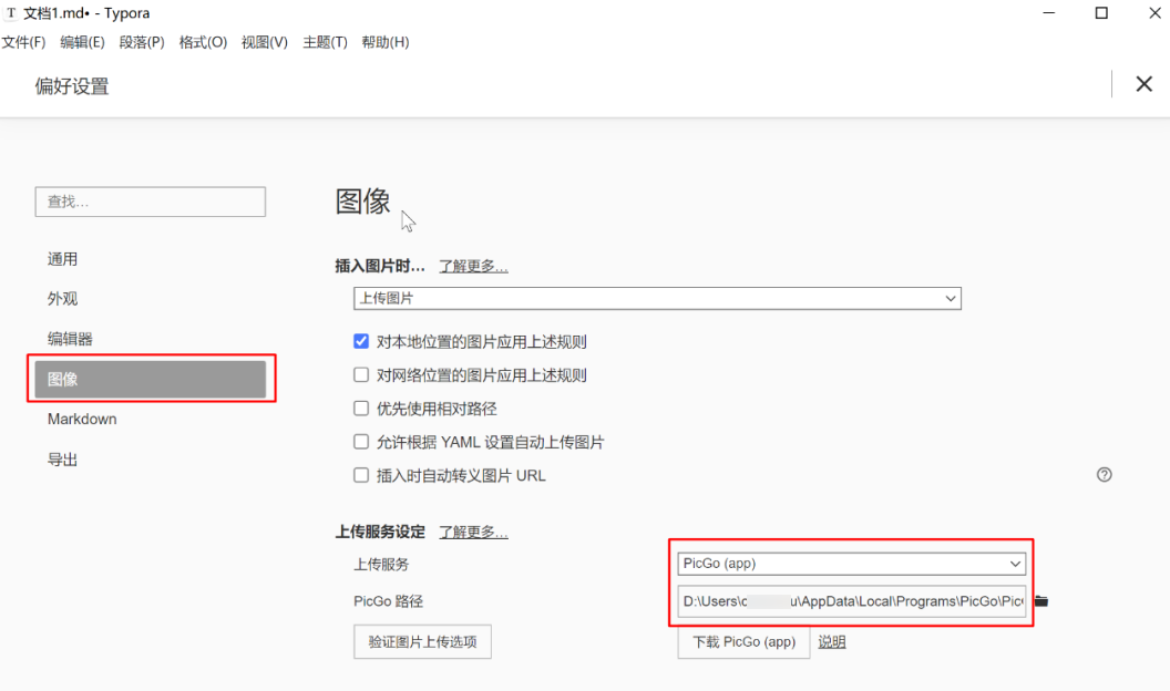 2.1 在 typora 的偏好设置的图像中,进行如下配置: