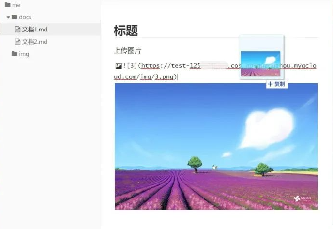 2.3 进入 typora 编辑器区域,直接拖放或粘贴图片,即可上传图片并自动替换为 COS 文件链接。(如果粘贴后没有自动替换为 COS 链接,可以检查 PicGo 中的 server 设置是否已打开)。