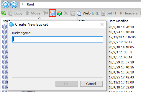 单击图中的图标,在弹窗中输入完整的存储桶名称,例如 examplebucket-1250000000。输入无误后,单击 OK 即可创建完成。 关于存储桶的命名规范,请参见 存储桶命名规范。