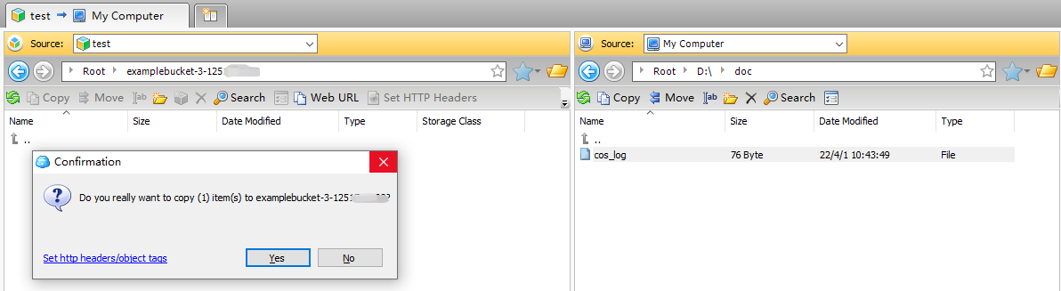 在存储桶列表中选择需上传对象的存储桶或路径,然后在本地计算机中选择需上传的对象,并将其拖拽到左侧窗口中,即可完成上传操作。