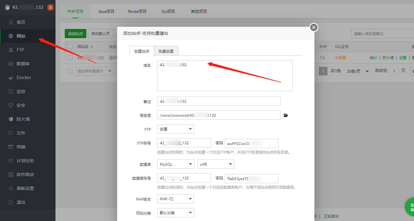 2. 单击添加站点,并配置相关参数,输入 CVM 的 IP,其他配置(根目录、FTP 账号、数据库账号等)保持默认。