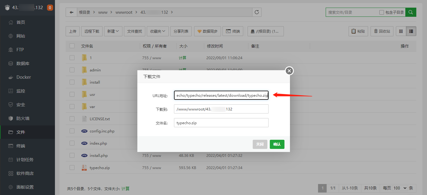 4. 单击文件导航栏,在文件页面中单击远程下载,填入 Typecho 的 GitHub 源码地址:https://github.com/typecho/typecho/releases/download/v1.2.0/typecho.zip,然后单击确认。