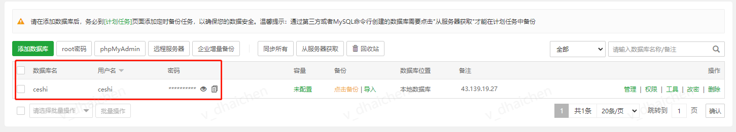 说明:可在宝塔界面中获取数据库用户名、密码、名字。