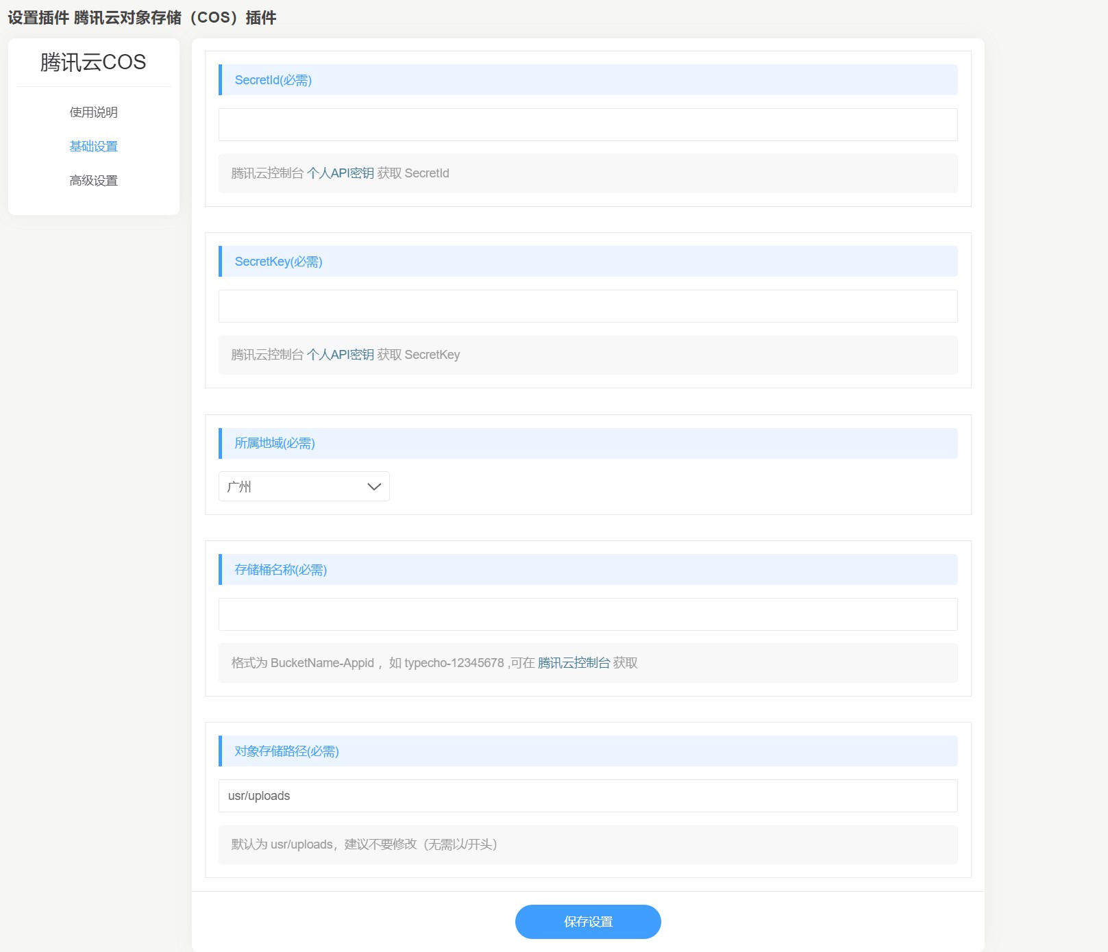4. 启用插件后,设置插件相关参数以便关联到 COS,配置信息如下: