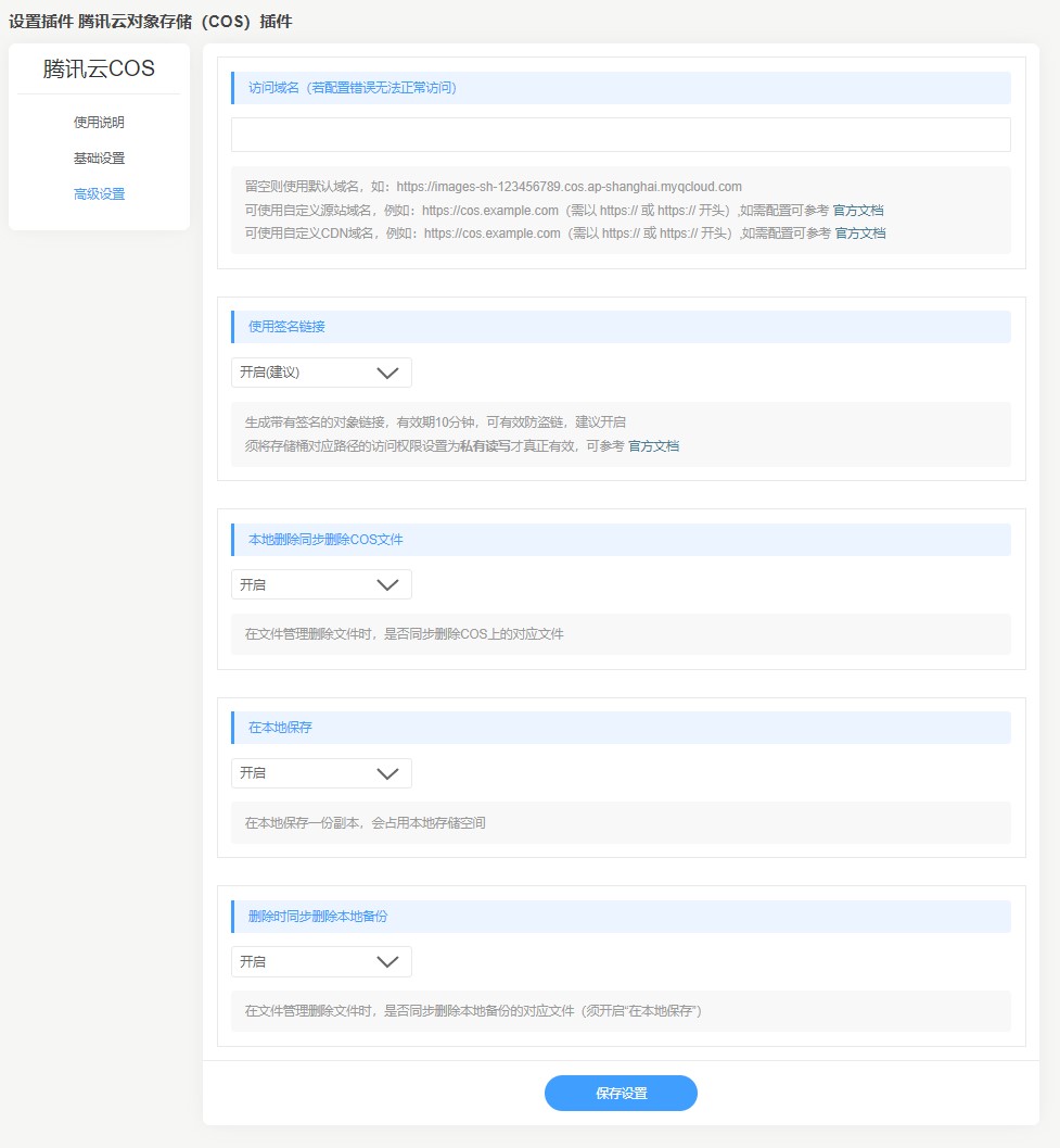 在本地保存 | 开启后,上传到 COS 的同时,自动在本地相同路径保存一份副本。建议不开启,会占用本地服务器的存储空间。 |