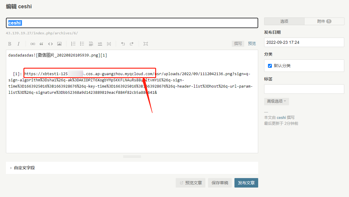 5. 完成以上设置后,即可完成博客系统的搭建,上传图片即可显示该 COS 的存储桶域名。