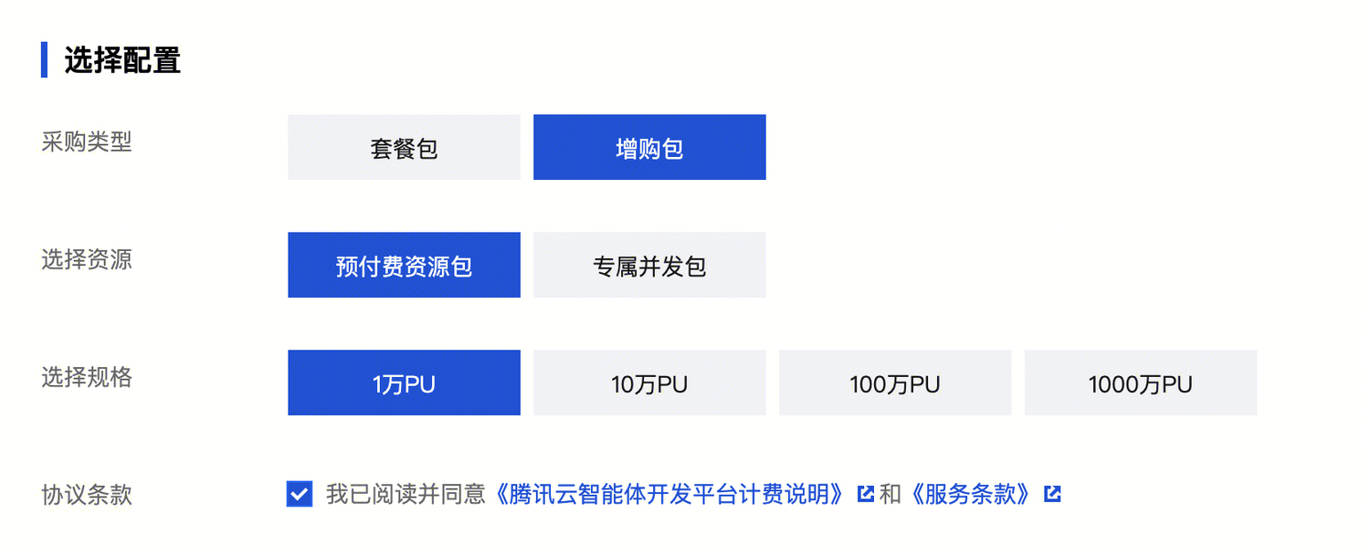 注意:具体可购买的套餐时长、增购包规格及价格,请以 腾讯云智能体开发平台-购买页 实际展示为准。