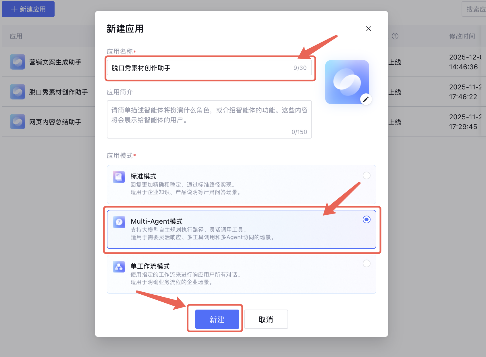 2.2 输入应用名称,选择 Multi-Agent 模式,然后单击新建,即可完成新建应用。新建后自动进入应用设置界面。