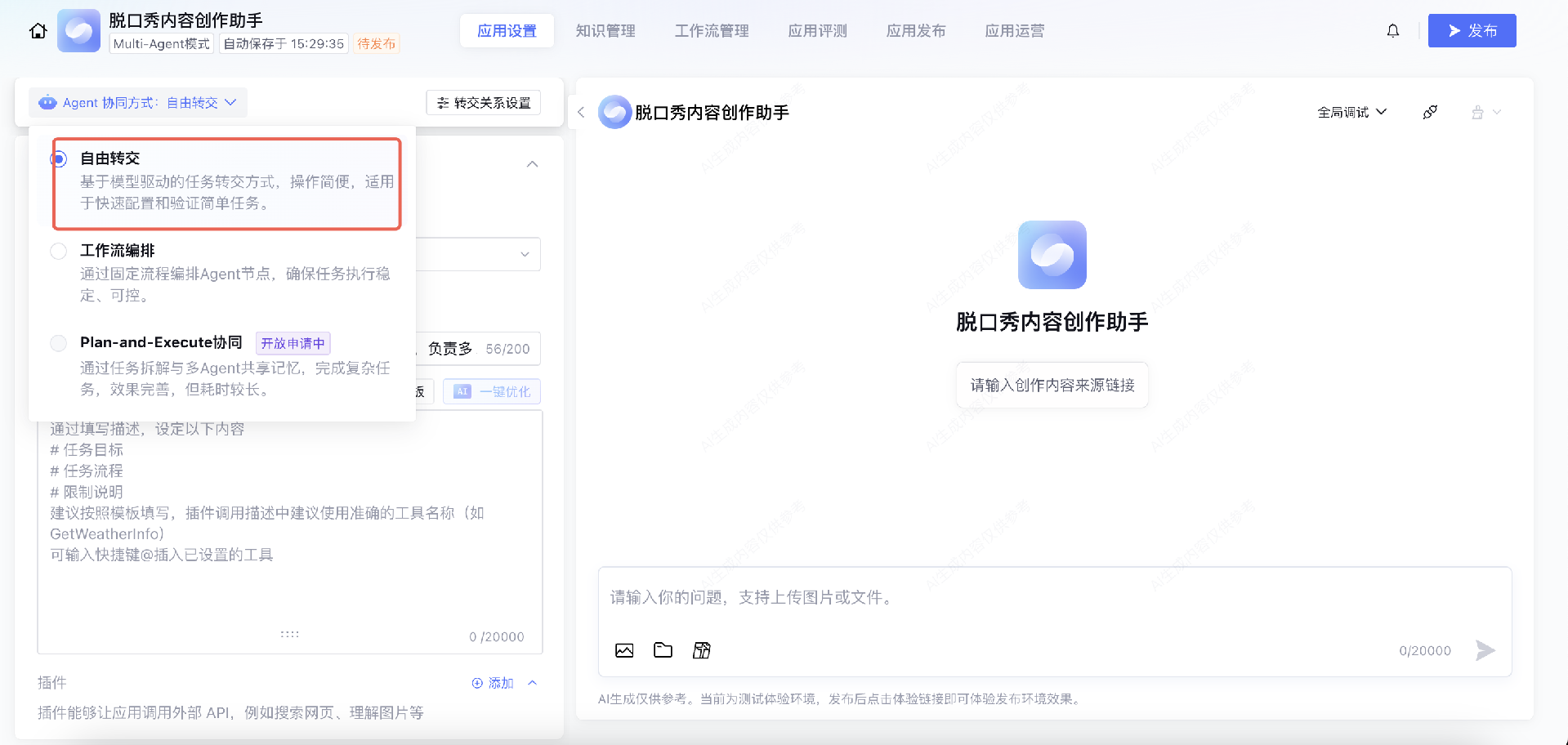 至此您已实现基于“Multi-Agent 模式”创建“脱口秀素材创作助手”。如需了解标准模式和单工作流模式应用可参见: