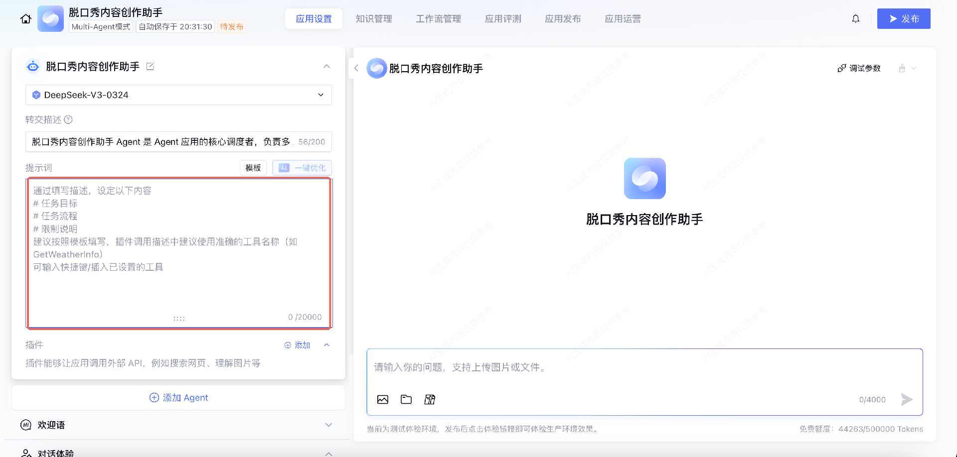 在提示词部分,可输入针对大模型的精细化指导内容,如任务目标、任务流程、限制说明等,通过清晰明确的提示词指令,精准引导大模型执行指定任务,生成符合预期标准的回答内容。