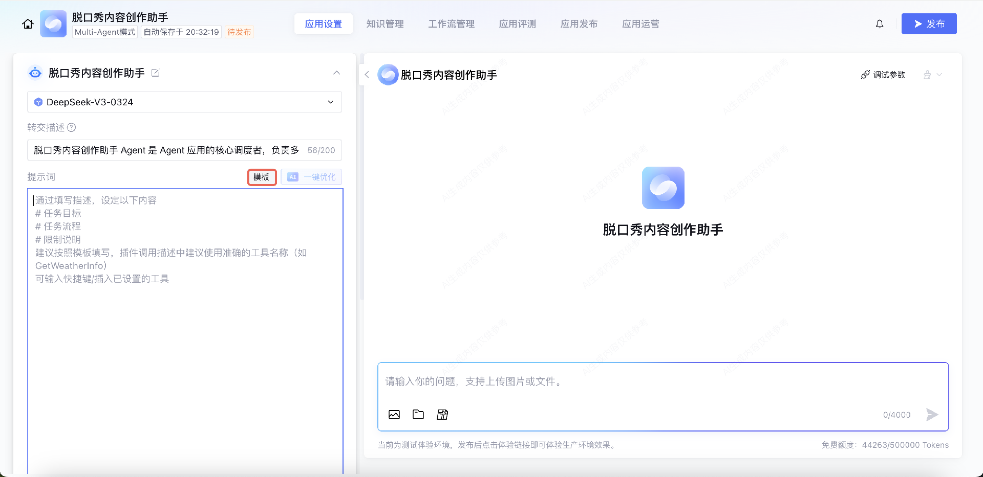 单击模板,可在预设的提示词模板库中选择适配当前场景的模板,如角色扮演类、知识问答类、内容生成类等,既能快速完成提示词配置,也能提升输出的一致性。