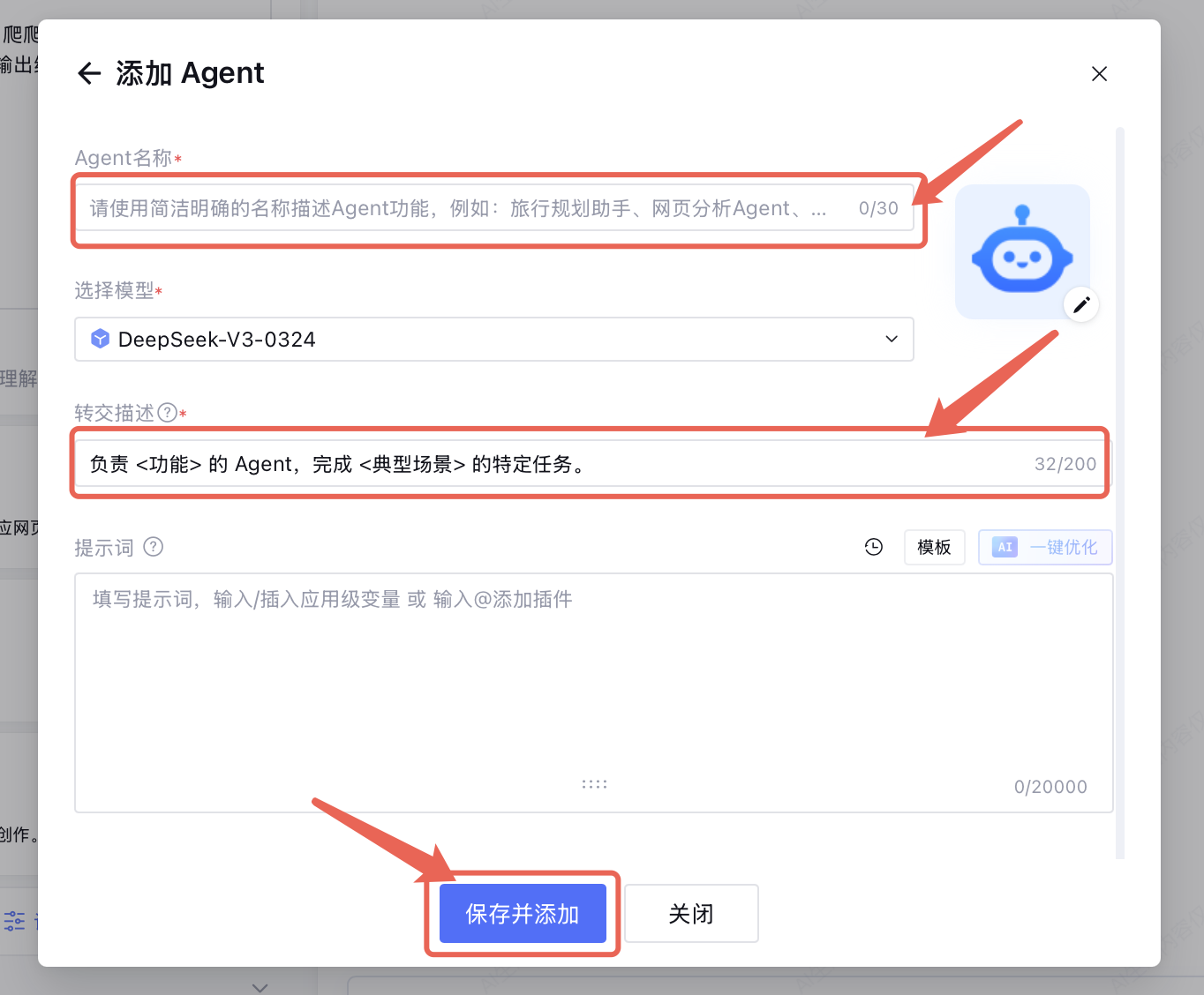 填入 Agent 名称、模型、转交描述、提示词。