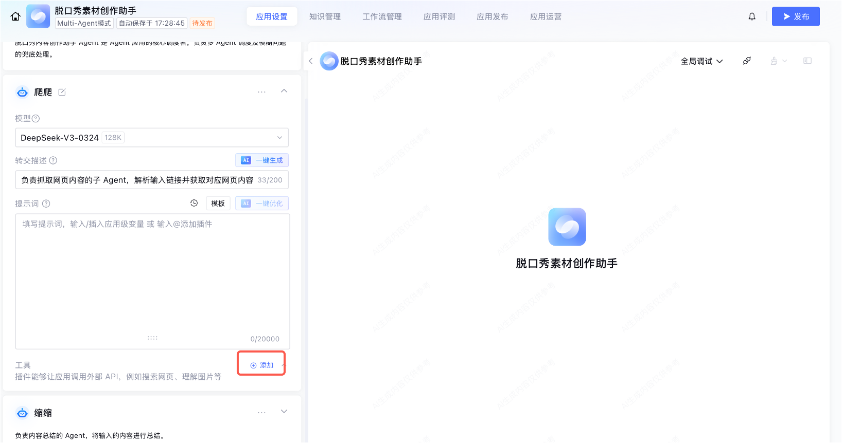 子 Agent 缩缩负责内容总结,将 Agent 爬爬输入的内容进行总结。